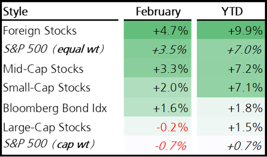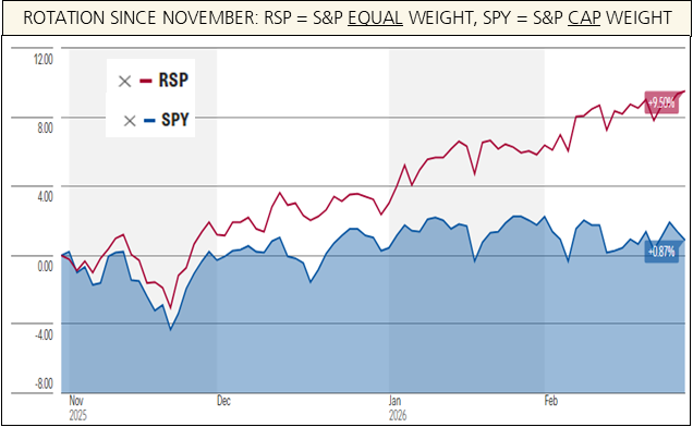 Today is not 2022 and the backdrop is very different, but if January hinted at “Rotation” (the title of our January commentary), February confirmed it. Turn! Turn! Turn! There were so many developments during the month and unfolding presently that it feels nearly impossible to address each of them in significant detail. While Venezuela’s regime was removed in January, the last several weeks remained dizzying as the US Supreme Court struck down last year’s tariff framework in a 6 – 3 ruling, an “AI-apocalypse” narrative ricocheted across markets, and now an open conflict with Iran commencing on the final day of the month. When events cluster this tightly, it can feel like instability. But markets rarely turn because of headlines; headlines tend to reinforce new trends (turns) already underway. Since October, rotation of market leadership is impossible to ignore.