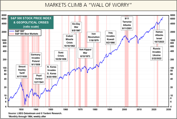 Concerning Iran, energy markets are the most direct economic linkage. Oil prices matter because they directly influence inflation expectations and interest rates. In recent days oil prices are spiking; however, oil often traded lower 12 months after geopolitical spikes. Shipping costs also need to be monitored. What ultimately determines economic impact is whether supply disruptions become sustained and structural. In the early days of March, markets are adjusting but history reveals that conflicts usually do not create lasting impact on financial markets. No one knows for sure how the conflict will continue to unfold. Long-term investors should not allow the short-term uncertainty and volatility to shake them from maintaining asset mixes appropriate for their long-term objectives. Time in the market is critical to earning attractive returns.