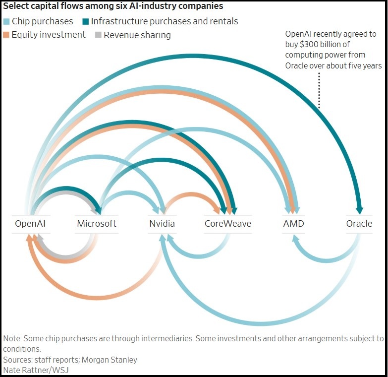 This “top-heavy” performance is once again dominated by the Mag 7 and AI exuberance. A popular chart shared this past month by the Wall Street Journal outlined how various AI companies are now “circularly investing” and fueling AI buzz and high valuations. Surprisingly, outside of this AI-related exuberance, defensive sectors led the markets higher in October. Sectors such as