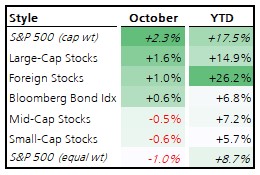 During several trading sessions in October, the S&P 500 index managed to advance even though the majority of stocks declined for the day. How is this possible? Recall the S&P is market weighted, and the 10 largest companies now account for 42% of the index value (an all-time high!). So even though the average stock suffered, the largest companies advanced, pulling the index up. In fact, the S&P 500 index advanced +2.2% for the month, while the equal-weight version declined by -1.1%. This is a historically rare setup. When breadth was previously this weak (250 or more declining stocks vs. advancers), forward performance was often uninspiring or even weak according to Bespoke Research.