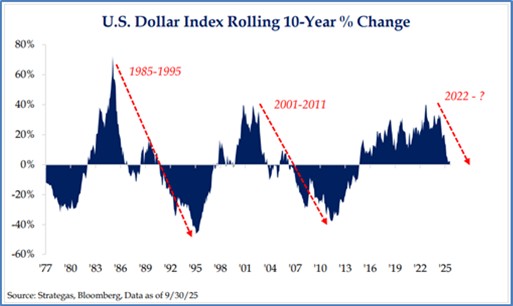 Despite a strong rally YTD, foreign equities continue to trade at significant discounts relative to domestic counterparts, supported by the weakening of the US dollar. In fact, the US dollar is now 10% weaker against a basket of